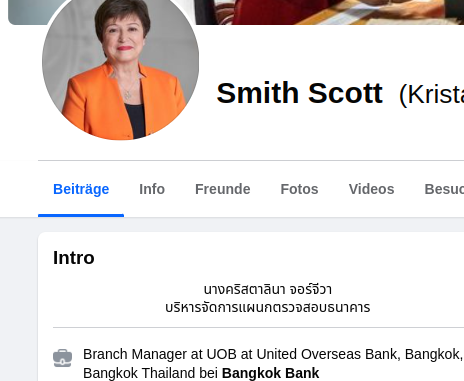 Es könnte sein, dass das Profil gehackt wurde, aber was Smith Scott (Kristalina Georgieva) dort insgesamt abliefert, ist einfach nur Grütze. Die Bettelei disqualifiziert das Profil als Fake!