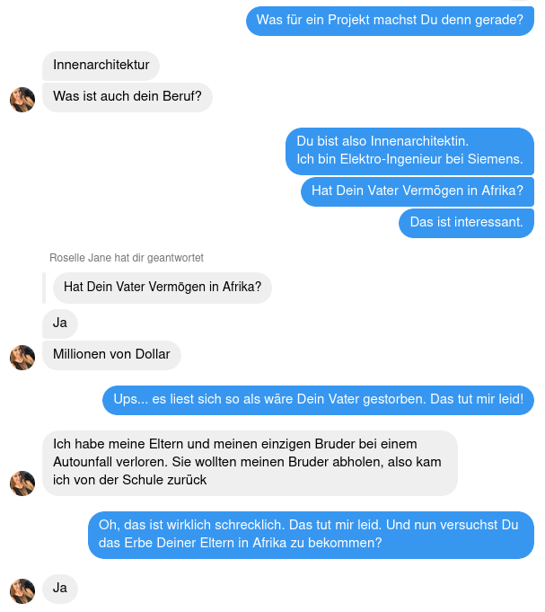 Es hat sich wieder ein Chat entwickelt, der sich auch gleich wieder in die richtige Richtung entwickelt. Die Dame will aus Deutschland sein, aber nun in Afrika das Erbe ihres Vater antreten. Hurra!